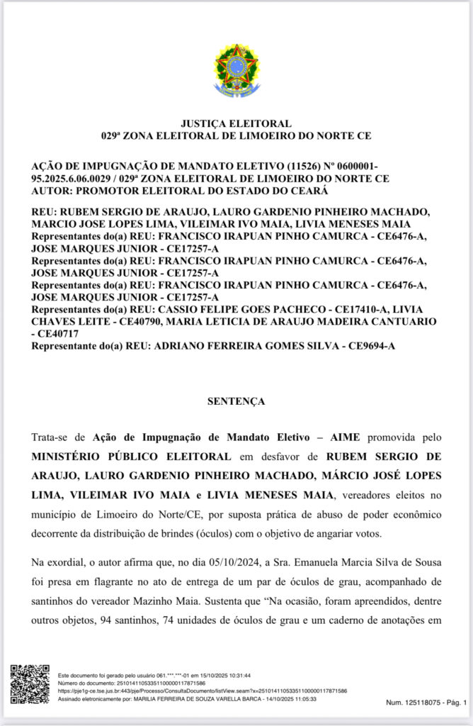 A Justiça Eleitoral da 29ª Zona de Limoeiro do Norte julgou procedente a Ação de Impugnação de Mandato Eletivo (AIME) movida pelo Ministério Público Eleitoral e determinou a cassação do mandato do vereador Rubem Sérgio de Araújo, conhecido como “Cabo Rubem”, por compra de votos e abuso de poder econômico nas eleições de 2024. A decisão, assinada pela juíza Marília Ferreira de Souza Varella Barca, também cassou os mandatos de Lívia Meneses Maia, Vileimar Ivo Maia (Mazinho Maia ou Mazinho da Net), Márcio José Lopes Lima (Professor Márcio) e Lauro Gardênio Pinheiro Machado, todos acusados de integrar um esquema de distribuição de óculos e consultas oftalmológicas em troca de votos.