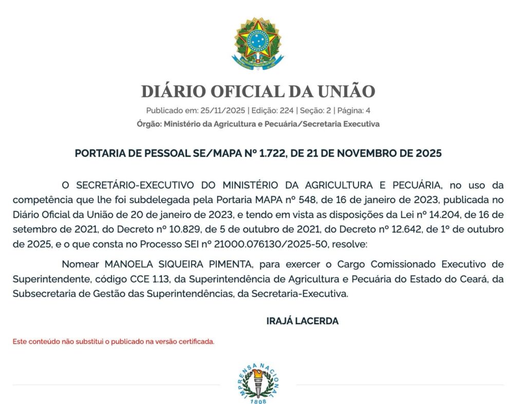O Ministério da Agricultura e Pecuária oficializou a nomeação da advogada Manoela Siqueira Pimenta para o cargo de Superintendente Federal da Agricultura e Pecuária no Ceará. A nomeação foi publicada neste 21 de novembro no Diário Oficial da União.