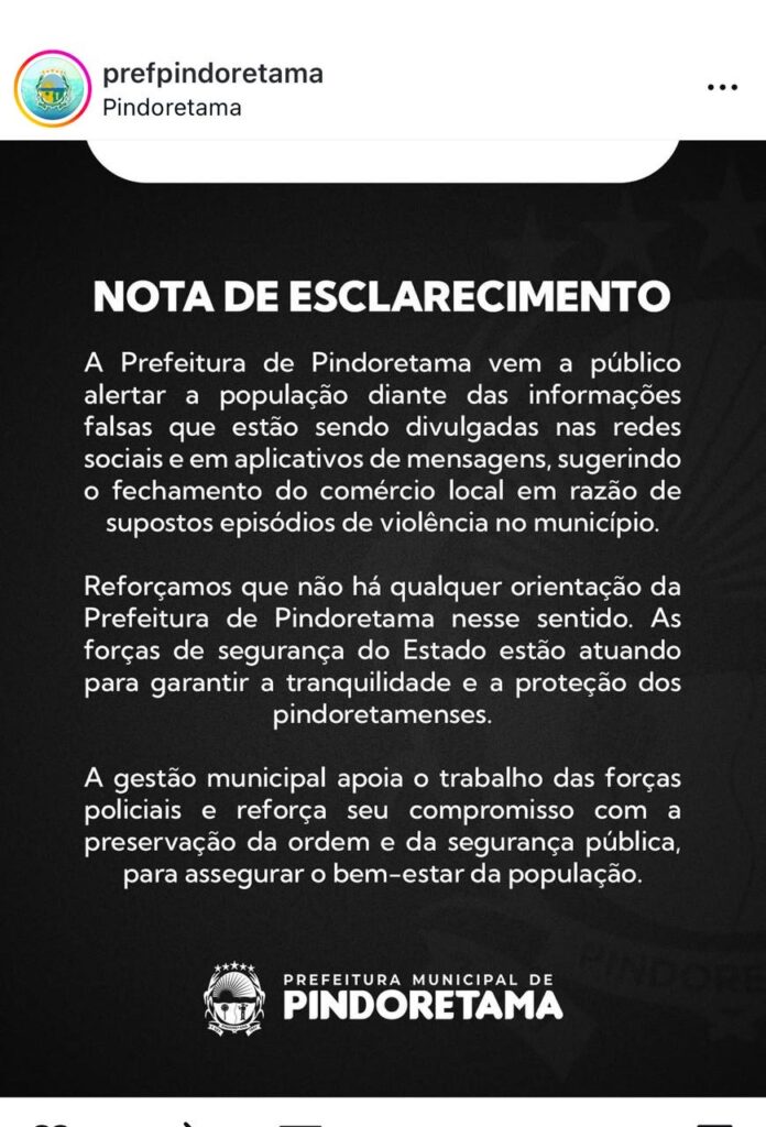 Rumores sobre o fechamento do comércio local circularam na cidade, possivelmente devido a boatos de atuação de grupos criminosos. A Prefeitura Municipal de Pindoretama emitiu um comunicado oficial para desmentir tais informações.
