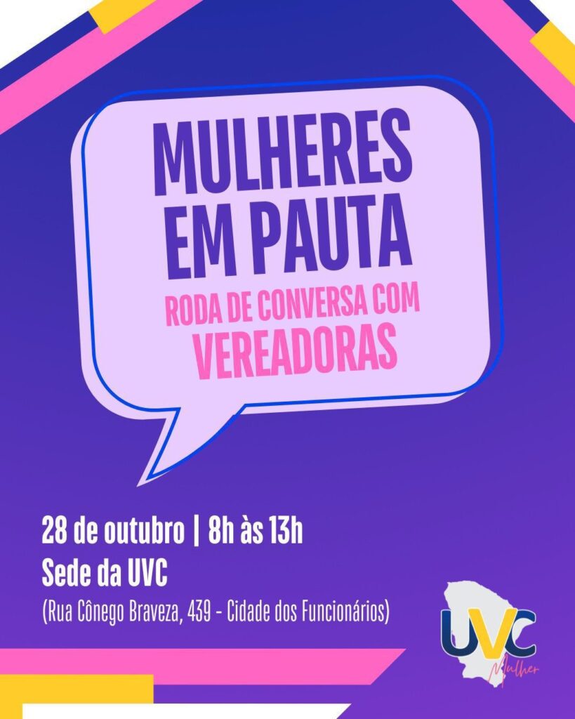 A União dos Vereadores e Câmaras do Ceará (UVC) realiza, no próximo dia 28 de outubro, a primeira edição do evento Mulheres em Pauta – Roda de Conversa com Vereadoras. O encontro acontecerá na sede da UVC, em Fortaleza, das 8h às 13h, e reunirá vereadoras de diferentes regiões do Estado para discutir políticas públicas voltadas às mulheres e temas relacionados à participação feminina na política.